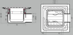 Heildarstærð niðurfallsins er 150x150mm en stærð ristarinnar er 130x130mm